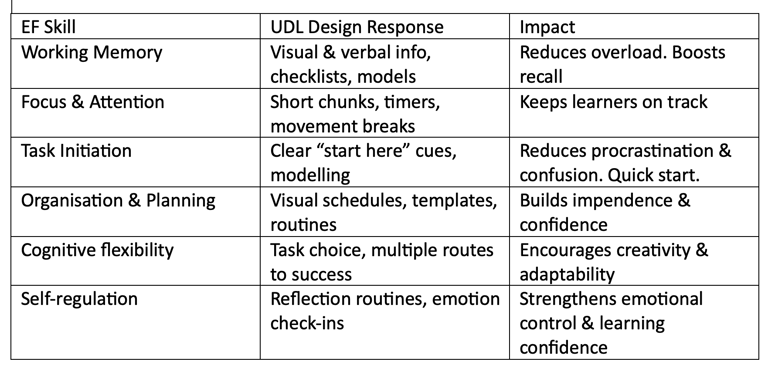 UDL supports these skills directly by using best teaching practices and smart lesson design to accommodate a range of executive function profiles — helping every learner build the skills they need to succeed, not just absorb content.